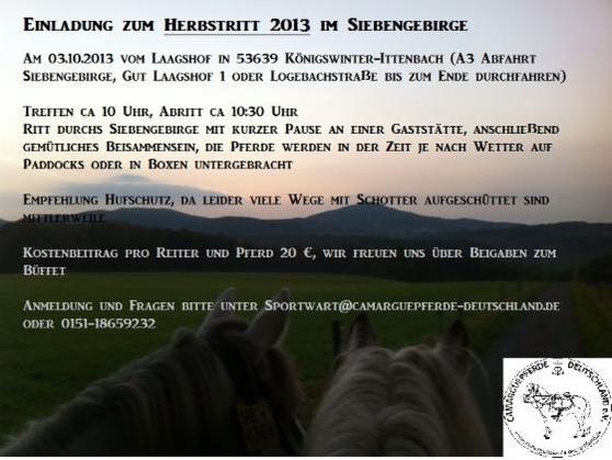 14. - 15. September Camargue-TurnierDie Ausschreibung für das diesjährige Vereinsturnier am 14. - 15. September 2013 auf der Reitsportanlage Asbacher Höhe findet ihr hier zum download: Ausschreibung Wir bitten euch, den Nennungsschluss zu beachten.